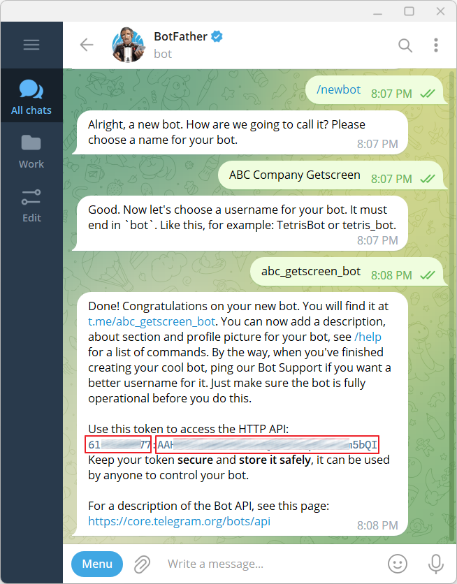 . Chat will ask you for a name and ID for your bot. Use your company name and postfix Getscreen.me