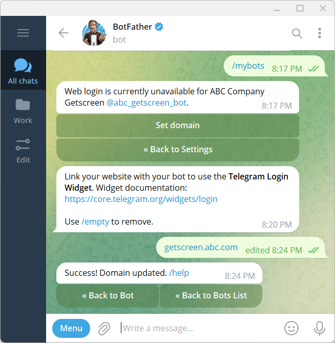Now you need to bind the domain name and configure webhooks for the bot.