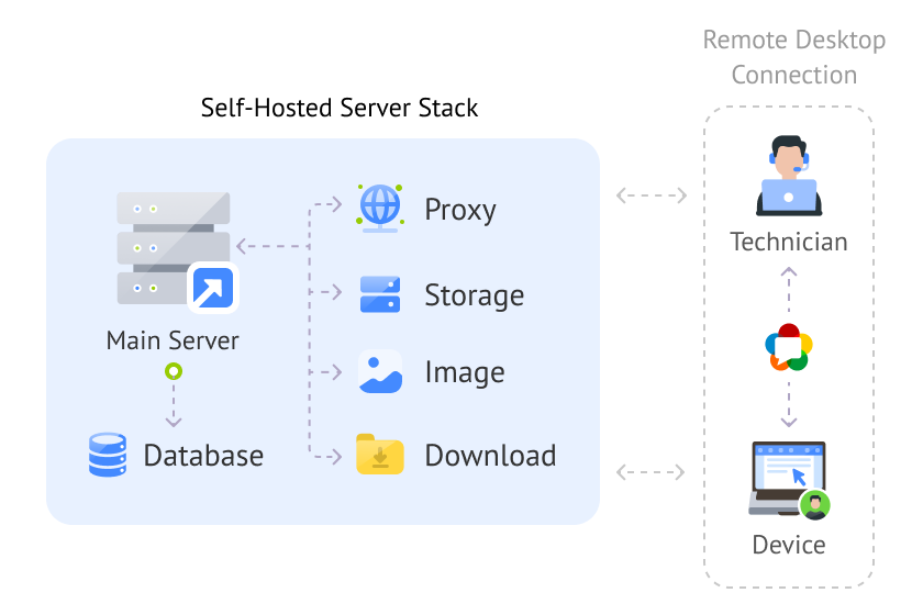 The Self-Hosted Server is a set of server components, each responsible for a specific function required to organize and manage remote access between technicians and devices. In addition to these components, the deployment includes a PostgreSQL database (version 14) used for data storage.
