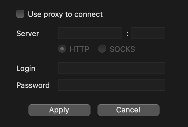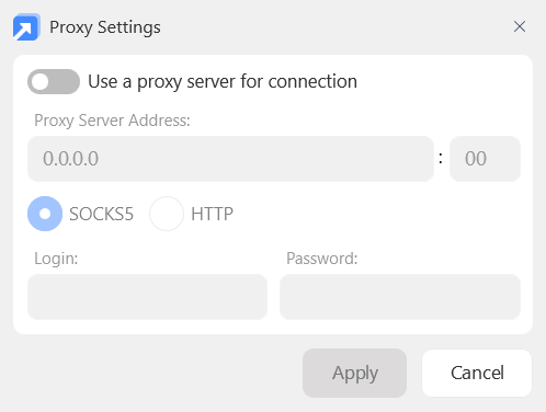 These settings are used when the device running the application connects to the Internet through a proxy server. You can specify authentication parameters for the application to connect to the Getscreen.me server via the proxy.
