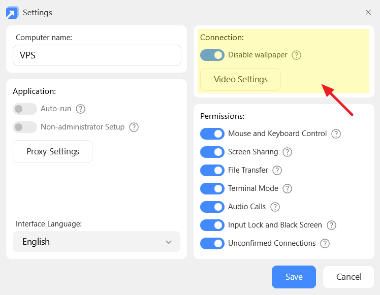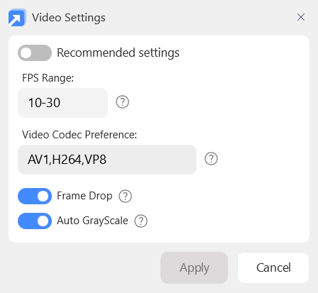 When connecting to a device in remote desktop control mode, the image from the remote screen is transmitted as a video stream. High-quality video requires stable network conditions, which may not always be available. Therefore, you can adjust the video encoding settings to reduce the amount of transmitted data.