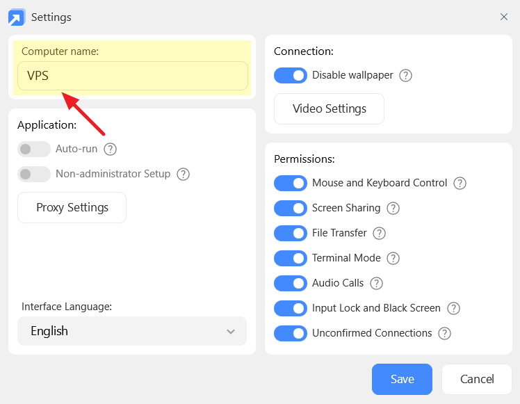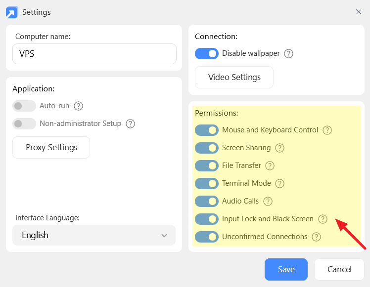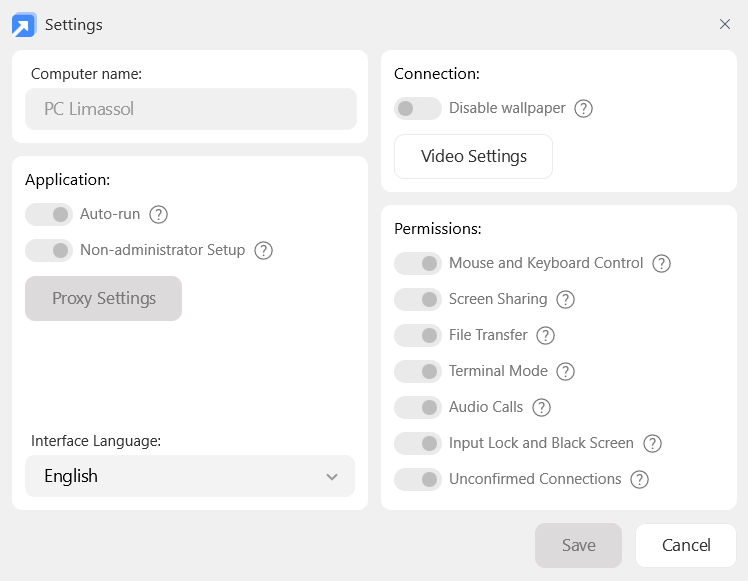getscreen.exe -config "name='My Computer' language=en autostart=true nonadmin=true control=true fast_access=false file_transfer=true audio_calls=false lock_input=true disable_confirmation=true auto_wallpaper_hide=true proxy='socks5://username:[email protected]:8080'"