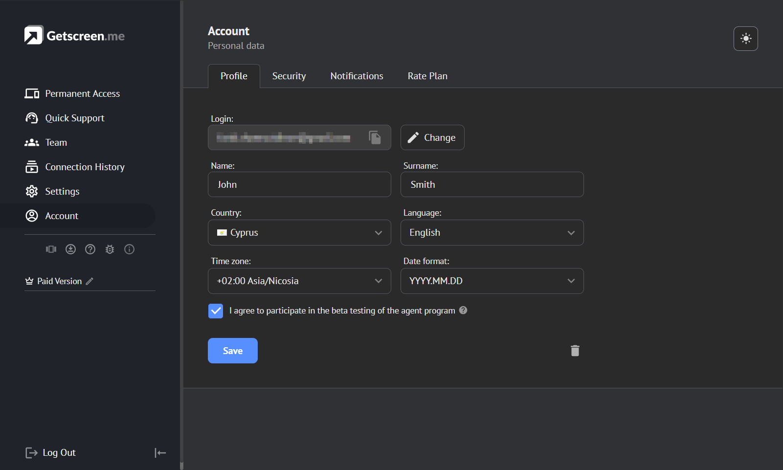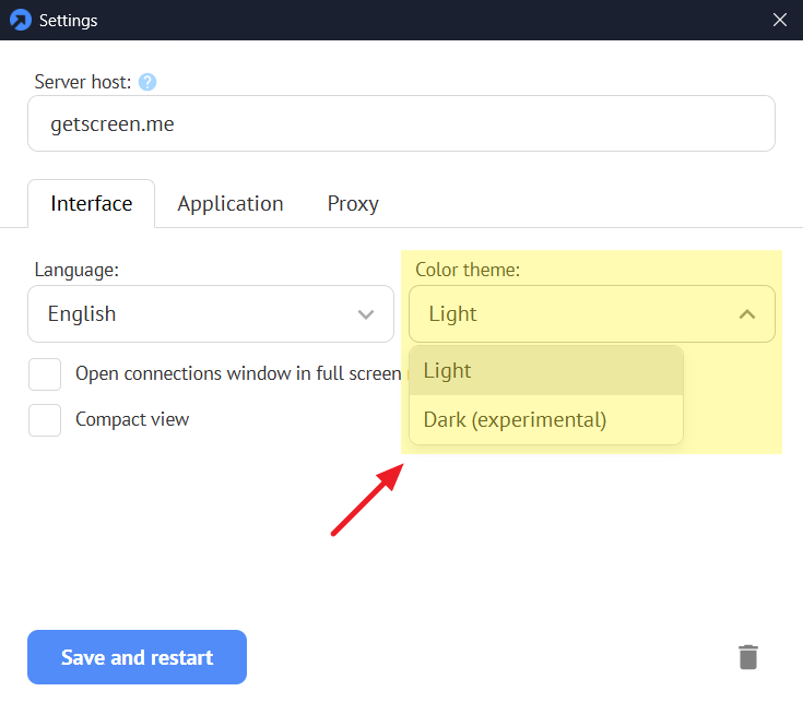 When connecting to a device from the interfaces described above, the selected theme is automatically applied to the connection window. However, if you connect not from the personal account but via an external link (a one-time link, a permanent link, or a link from an HTTP API integration), the dark theme must be enabled manually.