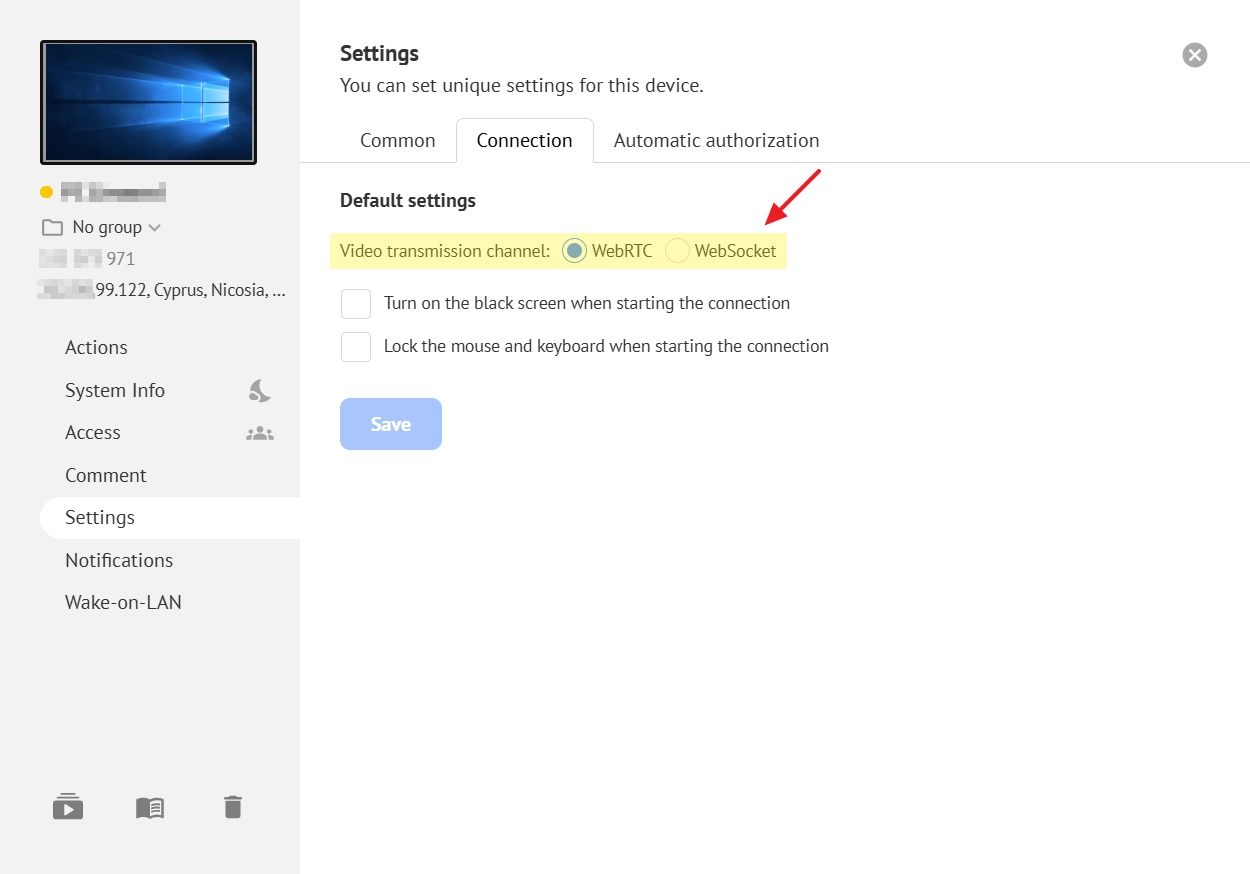 If you find that the WebSocket channel provides better quality in your environment, you can set it as the default for a specific device. To do this, open the device card, go to the Settings tab → Connection, and set the Video Transmission Channel field to WebSocket