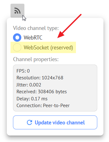 WebSocket is another mechanism for video transmission (without audio). It uses a persistent WebSocket connection via a special proxy server to receive video from the remote device. In this mode, video data is first sent from the remote device to the proxy server, and then delivered to the operator’s device. Because this introduces an additional relay (the proxy server), delivery speed between the two endpoints is typically lower.