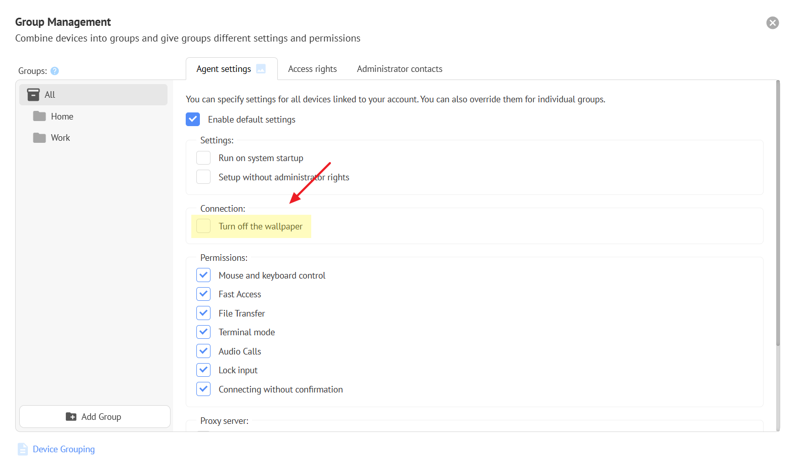 When enabled, this option removes the desktop wallpaper at the start of a session. This helps reduce the size of video packets transmitted from the remote device to the operator’s device. By default, the option is disabled, but you can turn it on.
