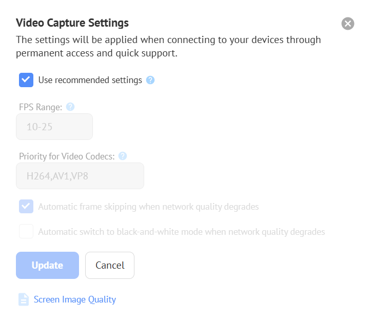 You can manage the video encoding settings used by the agent application on the remote device during a connection session. These settings determine how the image is transmitted to the technician’s connection window.